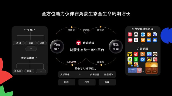 相较单一社交平台的广告系统,鲸鸿动能可覆盖多个APP(华为自有应用及联盟生态应用),并识别各端流量的流转路径;而对比其他终端广告系统,鲸鸿动能背后的鸿蒙生态更为多元,从手机到汽车,覆盖全场景智慧生活。
