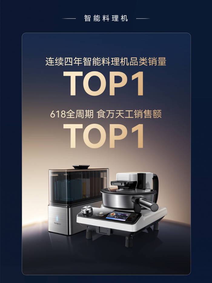 在牢牢巩固洗地机王者地位的同时,添可在智能家电生态布局的其他关键领域也同步高歌猛进。智能烹饪料理赛道,添可食万延续强势表现,连续4年稳居智能料理机品类销量TOP1。本次618全周期,搭载AI科技的旗舰产品“食万天工”表现抢眼,斩获销售额榜首,引领智能烹饪新潮流。