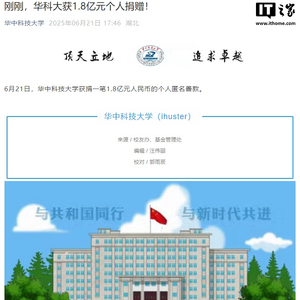 IT之家 6 月 21 日消息,今天下午,华中科技大学发文,宣布该校获捐一笔 1.8 亿元人民币的个人匿名善款,除此之外并未透露任何信息。