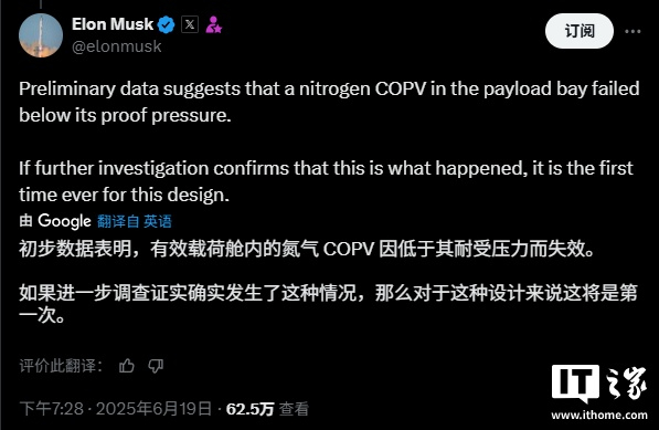 马斯克在事件发生后不久便分享了一些信息。在回复太空爱好者 @Erdayastronaut 的帖子时,马斯克表示:“初步数据表明,载荷舱内的氮气 COPV 在其验证压力以下发生了故障。”他还指出:“如果进一步调查证实了这一点,这将是这种设计首次出现此类情况。”