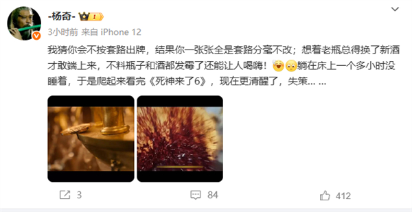 快科技6月22日消息,今日,《黑神话:悟空》美术总监杨奇微博发文,称自己躺在床上一个多小时没睡着,于是爬起来看完《死神来了6》,“结果现在更清醒了,失策……”