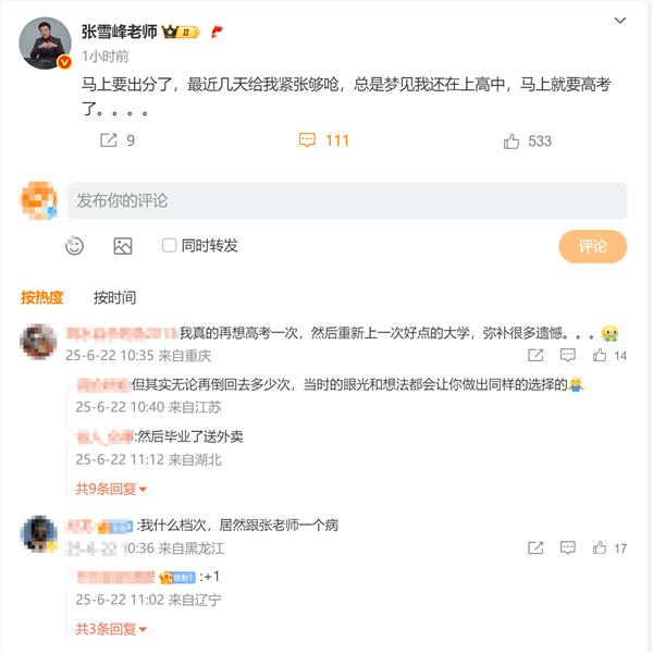今日,张雪峰在微博发文称:“马上要出分了,最近几天给我紧张够呛,总是梦见我还在上高中,马上就要高考了。”
