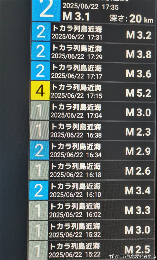另外,6月22日16时15分在琉球群岛发生5.2级地震,震源深度10公里,震中位于北纬29.26度,东经129.42度。