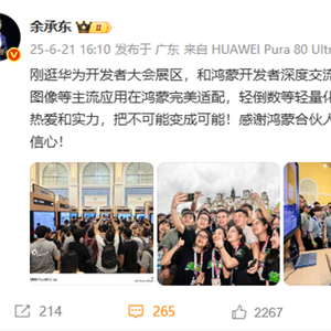 日前,余承东微博发文,称在华为开发者大会展区和鸿蒙开发者深度交流,很有感触,B站、WPS、悟空图像等主流应用在鸿蒙完美适配。