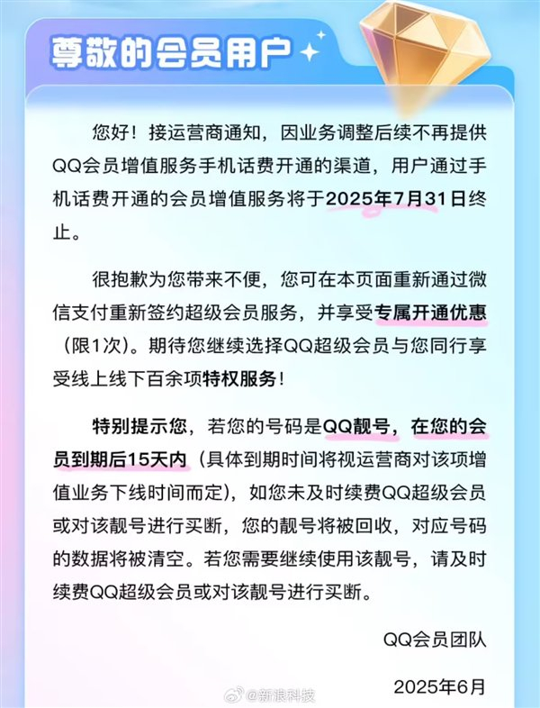 接运营商通知,因业务调整后续不再提供QQ会员增值服务手机话费开通的渠道,用户通过手机话费开通的会员增值服务将于2025年7月31日终止。