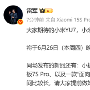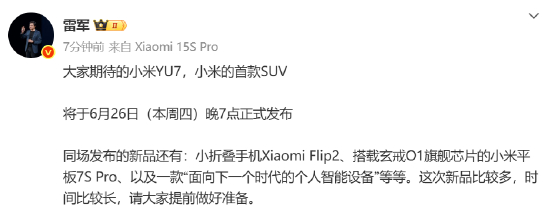 6月23日上午消息,雷军在网络社交平台表示,小米的首款SUV小米YU7将于6月26日(本周四)晚7点正式发布,同场发布的新品还有:小折叠手机Xiaomi Flip2、搭载玄戒O1旗舰芯片的小米平板7S Pro、以及一款“面向下一个时代的个人智能设备”等等。