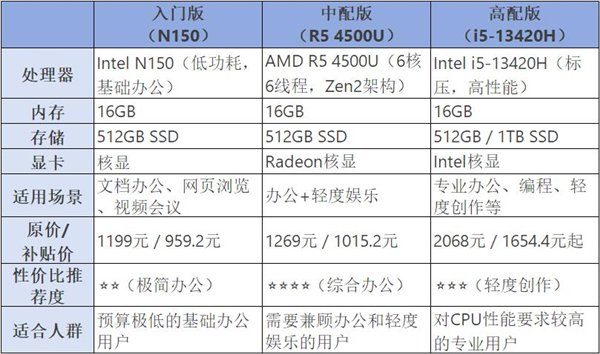 看完性能,我们再来对比一下性价比,目前N150平台的迷你主机价位均在千元左右,其中又有不少采用公模设计节约成本。同样是16+512的配置,大家在性能发挥方面大差不差,也就是说体验不会有明显差异。