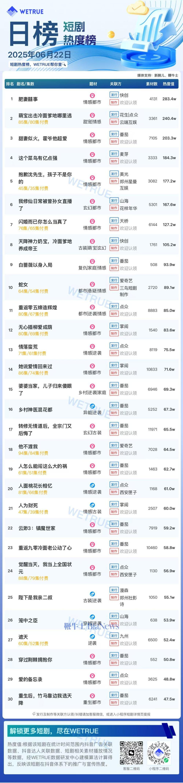1、本日榜为WETRUE短剧数据公司提供,新腕儿和鞭牛士提供联合支持。