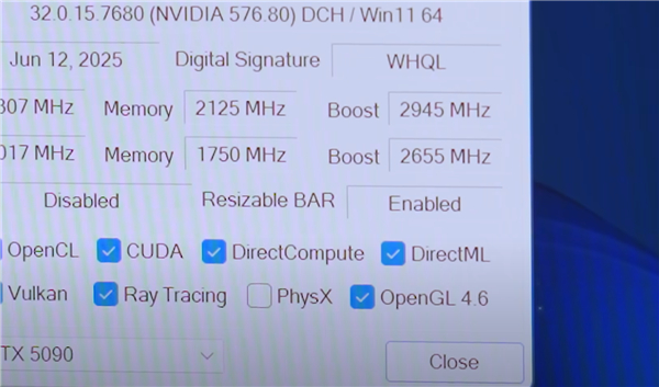 博主在自己的i9-14900KS、RTX 5090平台上测试,Resizable BAR开启前3DMark Port Royal跑分为37105,开启后提高到了40409,最高40602,提升幅度9.4%。