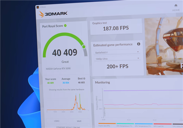 另一套i9-12900K、RTX 4090组成的“老平台”上,Port Royal跑分也从25937提高到26364,提升幅度约2%。