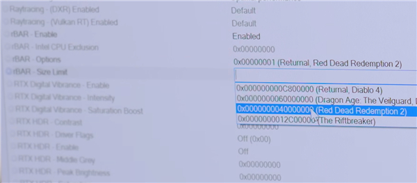 NVIDIA Profile Inspector里将rBAR参数设置为开启(Enable),同时修改下方的两个参数: