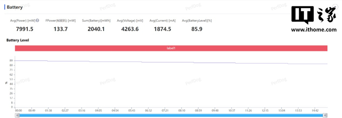 当然,更稳的游戏帧率和 1% Low 帧也是有代价的,《绝区零》的游戏平均功耗接近 8W,因此最高温度也提升到 42.1℃。不过 15 分钟的游戏耗电依旧是 7%,这与《崩坏:星穹铁道》是持平的。
