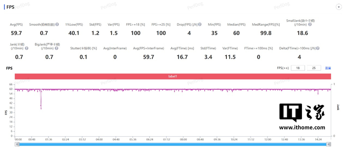 按照惯例还是在最高画质 + Vulkan(普通模式),25℃室温环境下,以 75% 亮度和 50% 外放音量在‘匹诺康尼-黄金的时刻’地图进行跑图测试,15 分钟后通过性能狗的测试结果来看,游戏平均帧数为 59.7 帧,40% Low 帧也达到了 40.1 帧,帧率曲线非常平稳。实际游戏中的体感温度比手机凉快不少,机身最高温度 41.5℃,而手持区域温度均在 36℃以下。