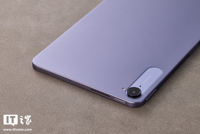 前置 800W 像素摄像头挖孔很小,被放置在平板左侧内边框中间位置(横向握持时),平板物理按键集中在中框左上角(横向握持时)的两侧。