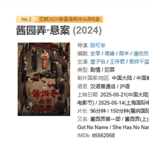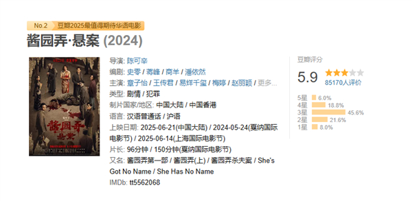 快科技6月23日消息,今日,电影《酱园弄·悬案》豆瓣开分5.9,超8.5万人评价。