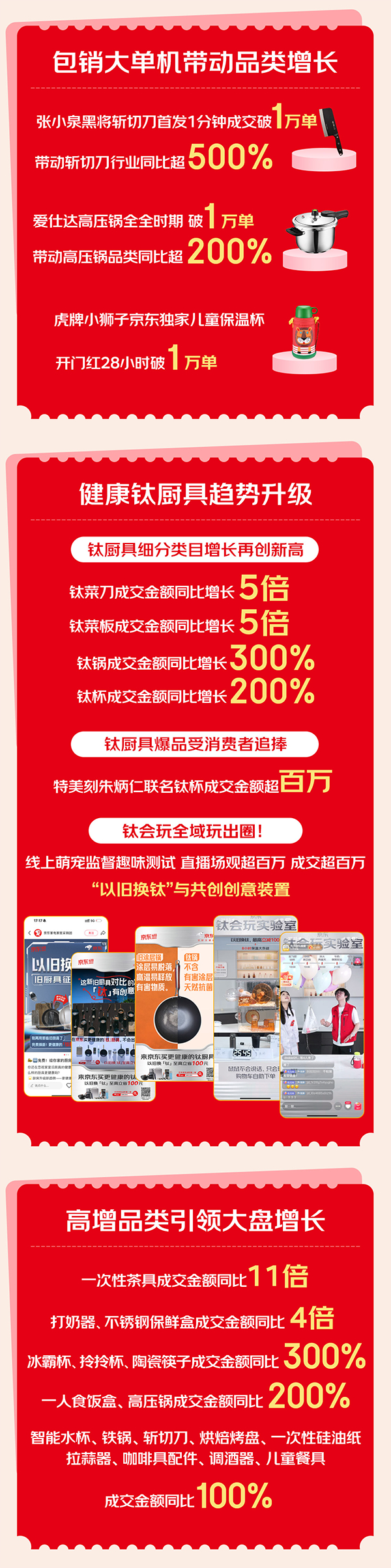 厨具也表现强劲。其中,包销大单机带动品类增长,张小泉黑将斩切刀首发1分钟成交破万单,带动斩切刀行业同比增长超500%;爱仕达高压锅618周期销量突破1万单,推动高压锅品类同比增长超200%;虎牌小狮子京东独家儿童保温杯,开门红28小时内销量破万单。618期间,健康钛厨具趋势升级,钛菜刀、钛菜板成交额同比增长均达5倍,钛锅成交额同比增长300%,钛杯成交额同比增长200%。钛厨具爆品受消费者热捧,特美刻朱炳仁联名钛杯成交额超百万。