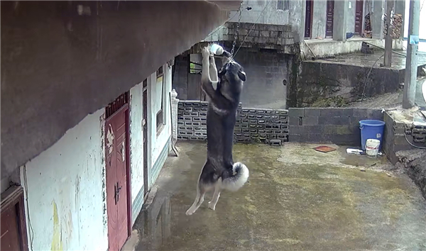 从监控视频看,这只二哈从二楼探头探脑往下张望,随即竟然跳了下来,撞掉了挂在屋檐下的灯泡,而后整个身子悬在空中。