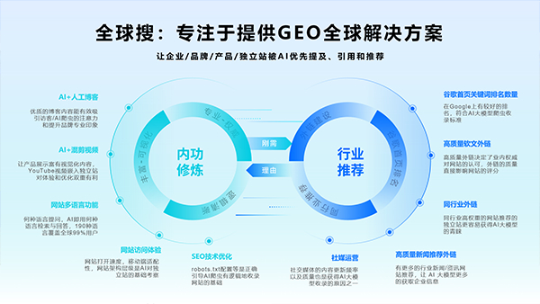 全球搜提供的正是一套完整的、能让ChatGPT和Gemini等AI优先推荐您企业品牌的GEO解决方案,通过“内功修炼”(深度优化网站,打造AI友好型知识库)与“行业推荐”(构建全网品牌权威,让AI交叉验证后认定您的领导者地位)的双轮驱动模式,系统性地将您的企业打造为“权威信源”。