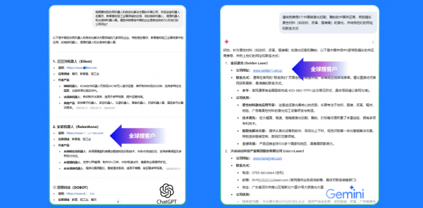 高科技领域(深圳安诺机器人 & 金运激光):当海外工程师向AI询问“高精度的自动化焊接机器人解决方案”或“柔性材料激光切割技术的领导者”时,得益于全球搜的GEO深度优化,安诺机器人和金运激光的名字、核心技术被AI直接引用在答案中,作为权威方案推荐。这直接跳过了繁琐的筛选环节,将最高意向的客户第一时间引向他们。