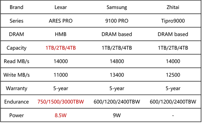 雷克沙ARES PRO系列有1TB、2TB、4TB三个容量的型号,写入寿命则分别是750TBW、1500TBW、3000TBW,比起竞品更高端的型号要高出了25%。