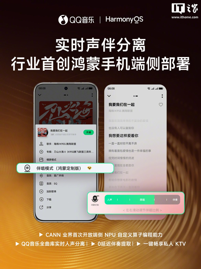 IT之家 6 月 23 日消息,QQ 音乐官方微博今日发文宣布:QQ 音乐鸿蒙 2.0 版本上线,业内首创鸿蒙手机端侧部署的实时声伴分离技术(官方公众号称“首创端侧实时伴唱技术”),成功实现全曲库实时人声分离。