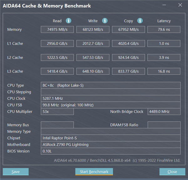 这自然会影响到实际的性能表现。我们以DDR5 4800MHz内存为例,当插两根内存组成双通道的时候,实测内存成绩为:内存读取74975MB/s、写入68123MB/s、复制67952MB/s、延迟79.6ns。