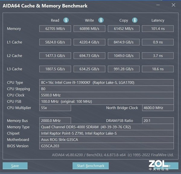 当如果插满四根DDR5 4800MHz内存的话,那么它的成绩就变成了这样:读取62705MB/s、写入60898MB/s、复制61452MB/s、延迟101.4ns。