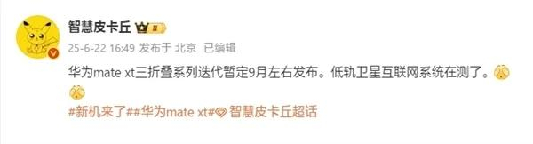 6月23日消息,据博主@智慧皮卡丘 爆料,华为新款三折叠暂定9月发布,此前消息称其命名为Mate XT 2。