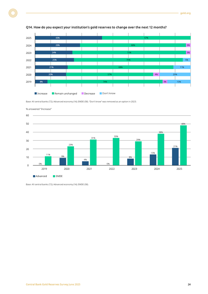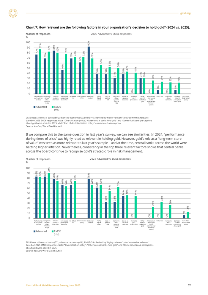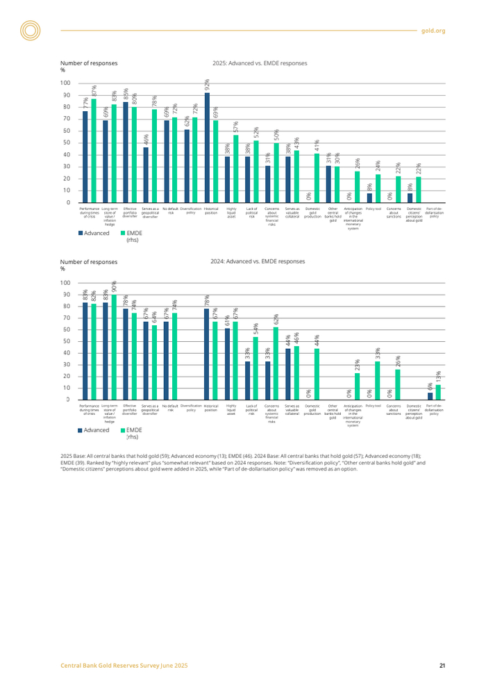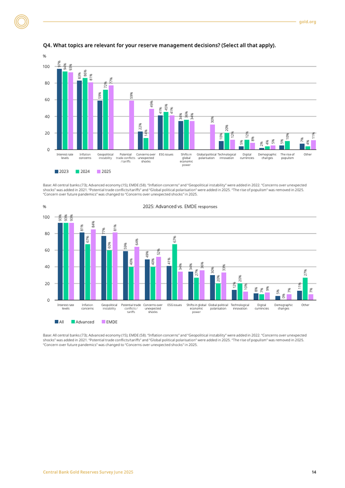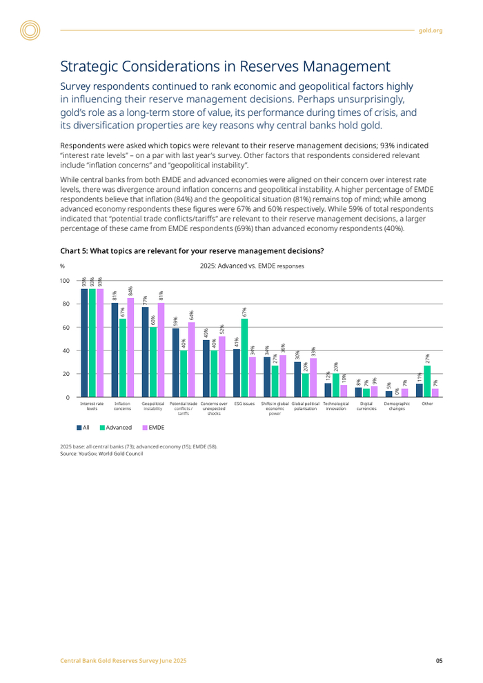 新兴市场与发展中经济体(EMDE)央行的购金意愿尤为突出,其计划增持的比例(48%)远超发达经济体(21%)。这反映了不同经济体风险偏好的差异:EMDE央行对通胀(84%)和地缘政治风险(81%)的关切程度显著高于发达经济体。