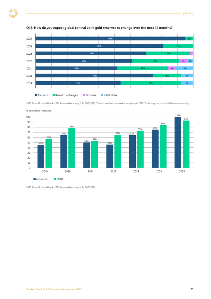 全球央行对黄金的战略配置意愿正达到历史高点。据对73家央行的调查数据显示,高达95%的受访央行预计未来12个月全球黄金储备将增加,该比例较2024年显著提升17个百分点,创下历史新高。