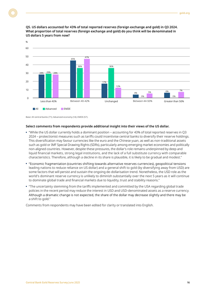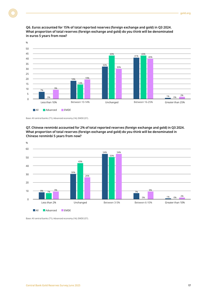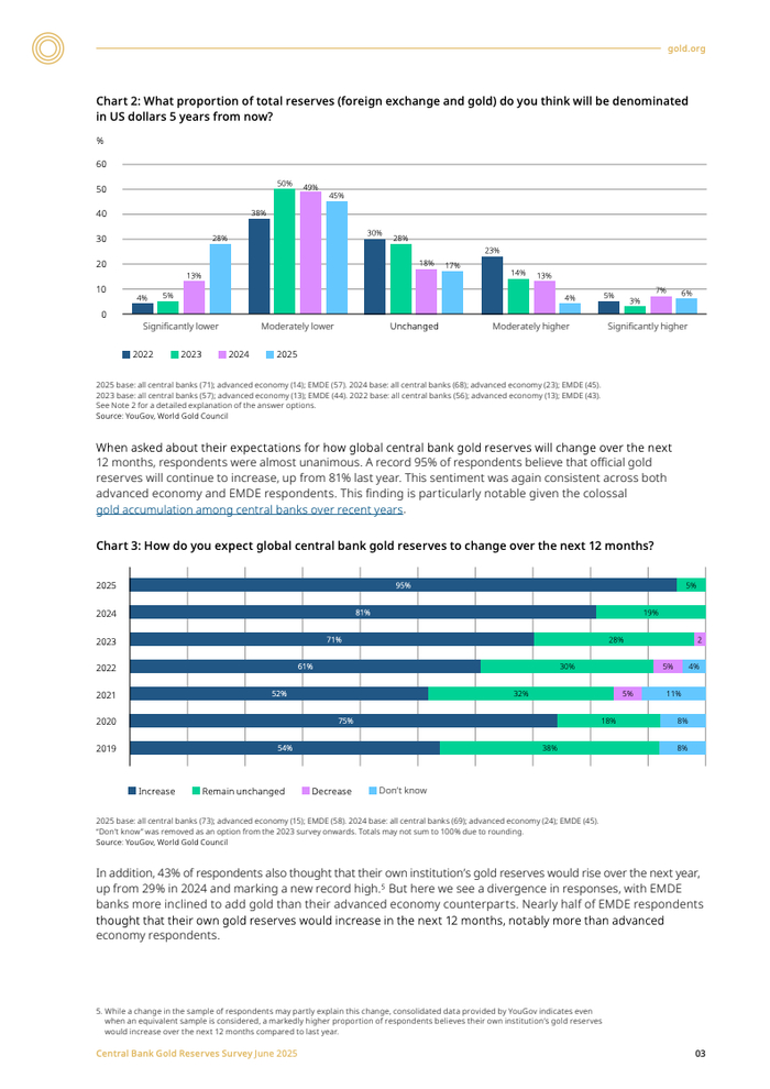 储备资产的本土化存储趋势亦日益明显,将黄金储备于国内的央行比例从2024年的41%大幅上升至59%。与此同时,73%的受访央行预测未来五年内美元在全球储备中的份额将下降,并预期黄金、欧元及人民币的占比将相应提升。