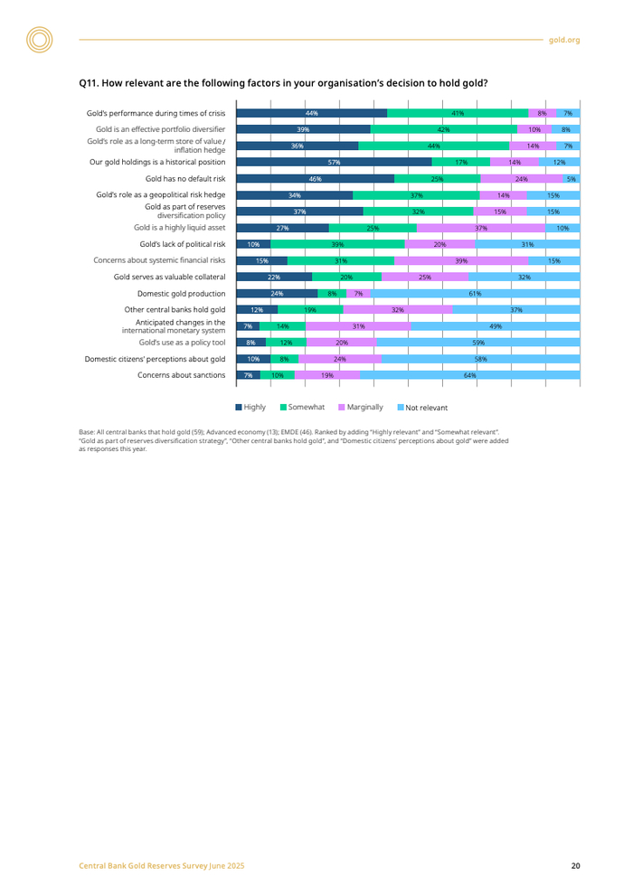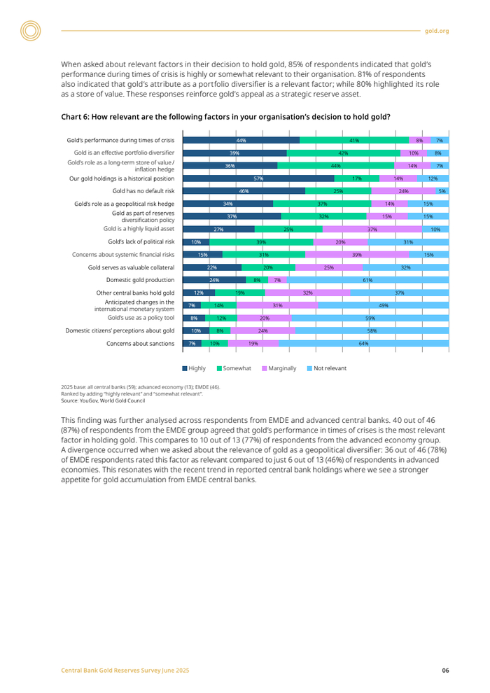 在具体操作层面,即便金价屡创新高,仍有43%的央行计划在未来一年内增持黄金储备。其核心驱动因素已从单一的价值储存演变为多元化战略考量,包括危机时期的表现(85%)、投资组合多样化(81%)以及长期保值功能(80%)。