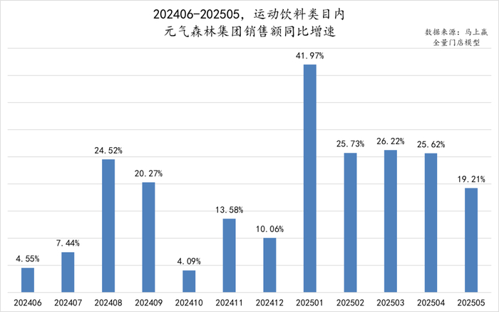 聚焦到以外星人电解质水为核心的元气森林自身在运动饮料类目中的发展情况,可以看到,近一年的时间中,所有月份均保持正向的销售额同比增速。进入2025年以来,增速似乎整体上了一个台阶,除了1月因为春节错位导致的超过40%的增长外,从二月到五月,元气森林在类目内的销售额同比增速始终保持在20%左右,增速颇高。