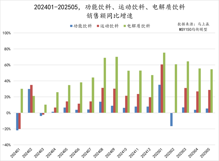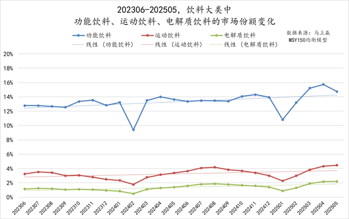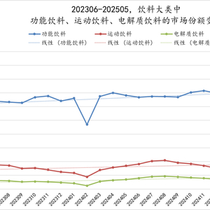 从份额上看,电解质饮料属于运动饮料类目中的一个类型产品,运动饮料则属于功能饮料中的一个细分类目。从三者的份额变化中可以显著的看到,三者在202306-202505近两年的市场份额变化中均呈现上涨趋势,其中的电解质饮料虽然在饮料大盘中整体占比还较小,但也呈现着较好的份额上涨趋势,截止2025年4、5月,类型产品在饮料大盘中的市场份额均已突破2%。