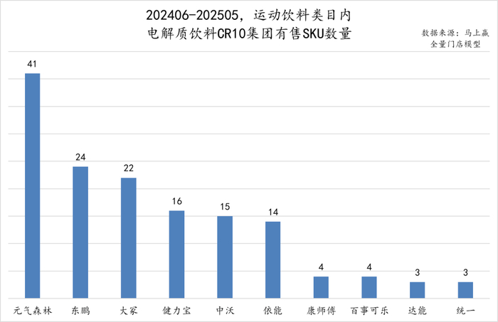 基于马上赢品牌CT中的数据可以看到,在202406-202505近一年的时间中,电解质饮料类型产品的有售SKU数量上,元气森林以41款有售SKU数量位居第一,明显领先于后面的东鹏、大冢等集团。第二梯队则是布局较早的健力宝、中沃、依能等集团。相比来说,康师傅、百事可乐、达能、统一等品牌的SKU布局数量与储备整体较少。在类目发展速度快、方向不好把握的前提下,丰富的产品储备也能通过概率的方式大大提升命中率,并对市场做出一定的方向上的引导。