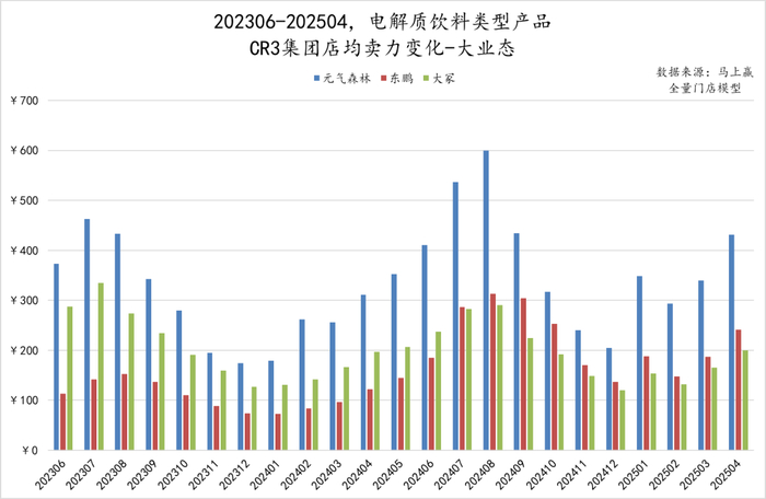 进一步聚焦在前三名,即元气森林、东鹏、大冢三家集团在大小业态中,店均卖力上的竞争与变化趋势。