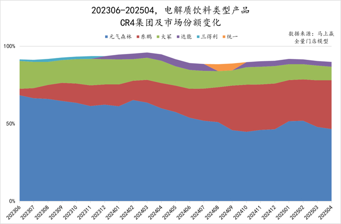 从CR6集团的市场份额排名上看,排名前三的集团在202306-202504期间只有元气森林、大冢与东鹏,唯一的变化在于2024年3月,东鹏超过大冢宝矿力水特晋升为排名第二。相比来说,第四-第六名的争夺则较为激烈,2023-2024年度,4-6名的常客为三得利、健力宝与达能,至2024-2025年度,4-6名的常客则变成了达能、统一与康师傅。