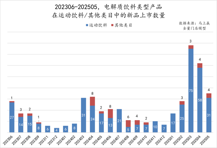 从202306到202505近两年内,电解质饮料类型产品的SKU上新情况看,电解质饮料的竞争正在2025年进一步加剧升级。从近两年运动饮料类目内电解质饮料的SKU上新数量对比看,2025年2-5月的上新数量比2024年同期的上新SKU数量多出一倍有余,足见竞争激烈情况。