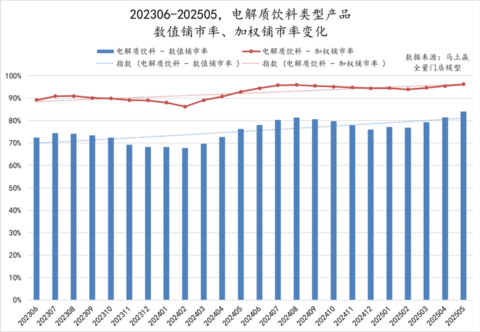 受到消费者追捧的同时,电解质饮料也受到了销售渠道的关注,在202306-202505两年的时间中,电解质饮料在渠道的铺市率上、店均卖力上都有了相当大的提升。铺市率的提升,为消费者解决了“买得到”的问题,店均卖力的提升则让渠道对于类型产品给予更多的关注和重视,为产品倾斜更多的资源。