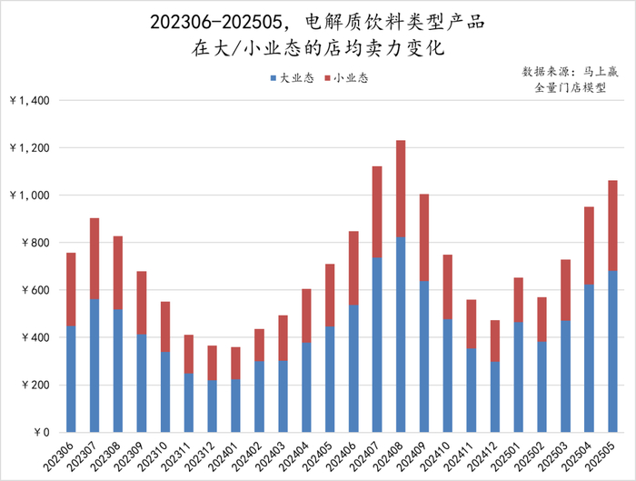 在店均卖力上,可以看到,自2023年6月起至2025年5月,电解质饮料类型产品在各业态中的店均卖力呈现出同比上升的趋势,大/小业态在期内均保持同比增长。店均卖力的持续提升,推动更多的渠道在更好的位置,用更多的资源来进行电解质饮料的销售,让消费者有更多优先选择电解质饮料的机会。消费者选择的增加,会进一步提升店均卖力,让渠道有着更多的销售积极性,从而形成正向的循环。