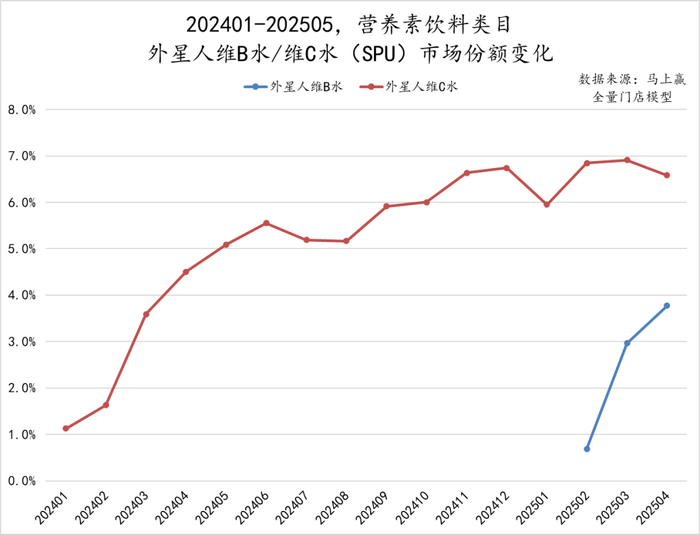 从数据中可以看到,2024年年初,外星人维C水率先投入市场并进行大规模推广,从2024年2月到2024年6月,短短四五个月的时间,维C水SPU(包含多规格、多口味)在营养素饮料类目中的市场份额快速拉升到超过5%,并在随后的202406-202504时间段中,保持这正向增长的趋势,该SPU截至2025年4月在营养素饮料类目中的市场份额已经接近7%。