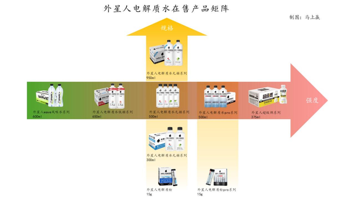 经马上赢研究整理,外星人的电解质饮料产品矩阵,基本围绕着“一横一纵”进行展开,更多的规格,更多的口味与对于专业补充需求的强度,使得整个矩阵可以适配更多的消费场景,无论是日常寻求“水替”,还是中高强度专业运动后补充电解质的需求,外星人电解质水旗下都有对应的产品能够满足消费者。