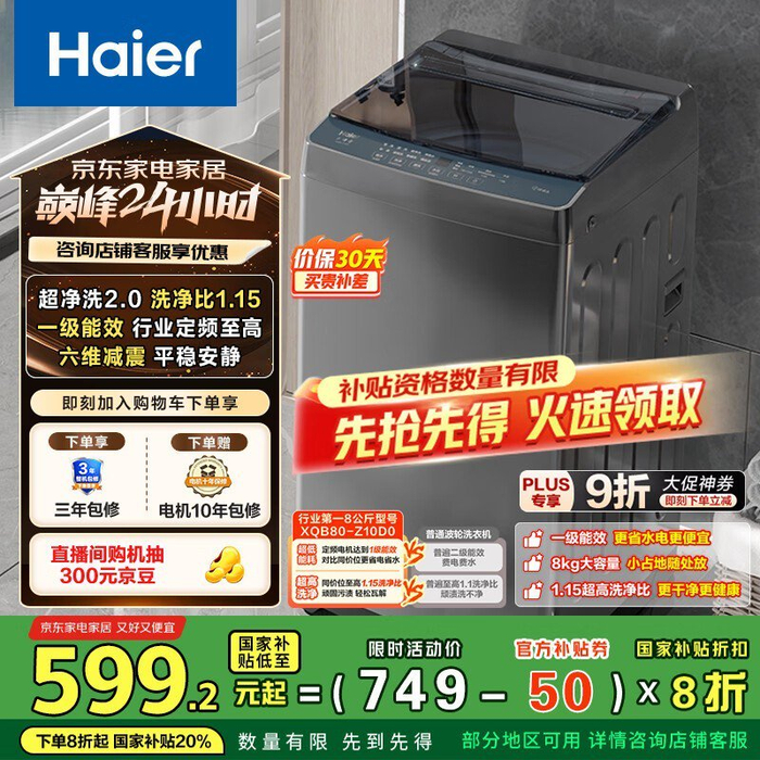 海尔8kg定频波轮洗衣机,京东到手486元