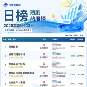 1、本日榜为WETRUE短剧数据公司提供,新腕儿和鞭牛士提供联合支持。