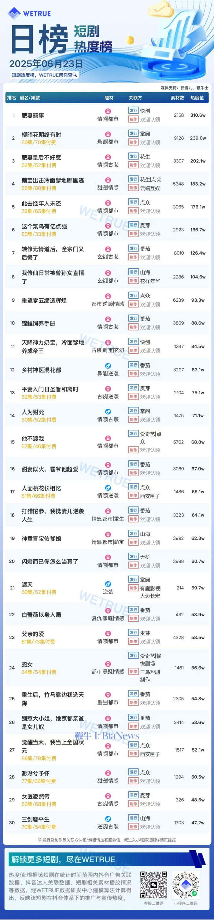 23日短剧热度榜:《肥妻囍事》连续第一,大盘热度5209万