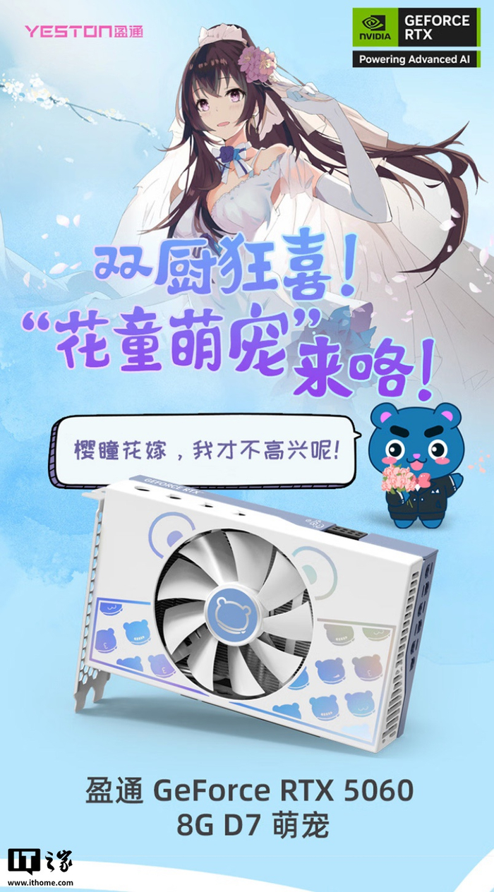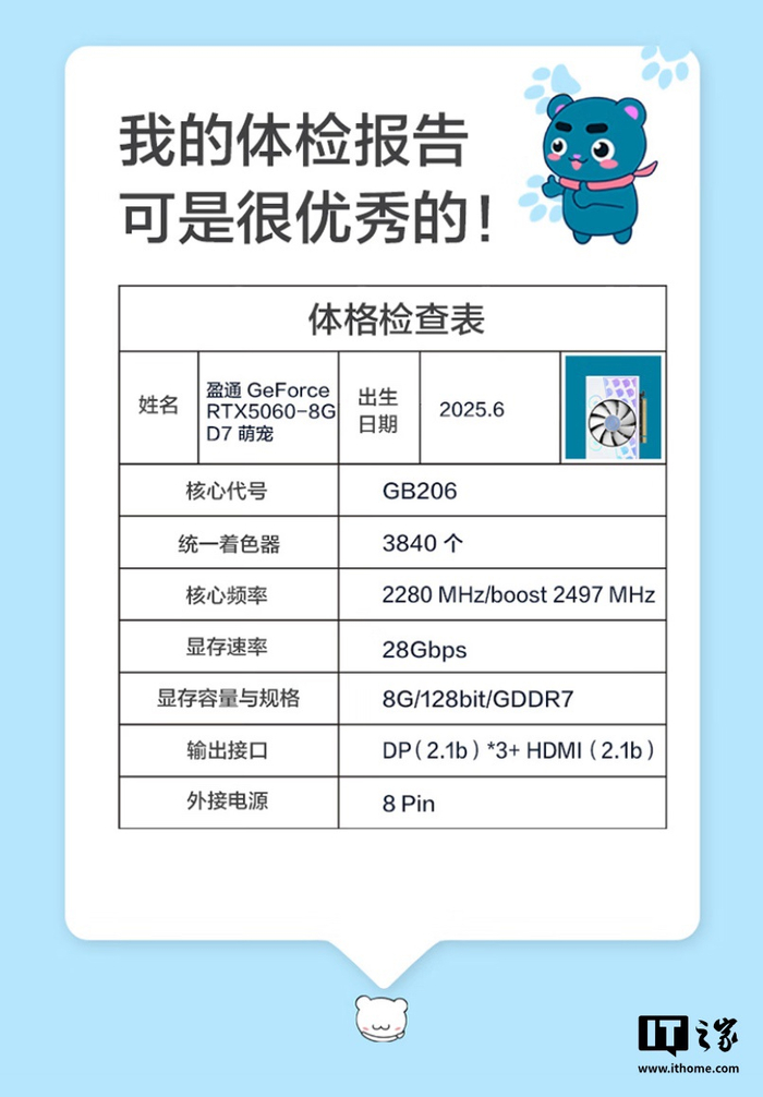 盈通推出 RTX 5060 8G D7 萌宠显卡:单扇 + 3 根 6mm 热管,2649 元