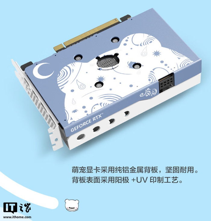 据介绍,该显卡整体采用白色配色,配备“萌宠”IP 印刷图案,相应图案具有镭射效果,不同角度有不同视觉呈现,显卡背面提供纯铝金属背板,同样带有 IP 图案。显卡整体尺寸为 174×114×40mm(含挡板为 185×129×40mm),兼容 Mini-ITX 平台。