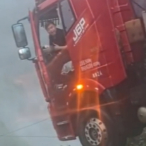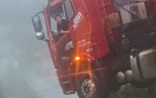 救援现场一段9分53秒视频记录救援全程。视频中,救援人员冒险登上卡车货箱顶部,碎步走到前方,卡车司机通过驾驶室后窗爬到货箱顶部,沿着绳索方向到达安全区域。