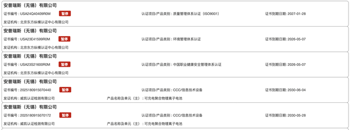 更严峻的是,安普瑞斯作为核心供应商,其认证暂停直接引发了行业性连锁反应。国家市场监管总局全国认证认可信息公共服务平台显示,安普瑞斯共有70多个3C认证证书显示暂停状态,所涉及的认证类别及产品项目包括质量管理体系认证(ISO9001)、CCC/信息技术设备等,产品名称多为可充电聚合物锂离子电池、可充电锂离子电池及锂离子电池。