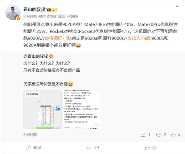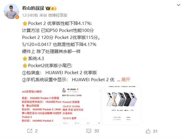 至于华为Pocket 2优享版是什么芯片,目前暂无准确消息,数码博主“看山的叔叔”认为不可能是麒麟9020A。